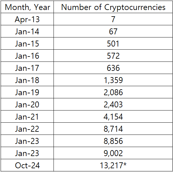 코인마켓캡과 코인게코에 따르면, 2024년 10월 기준으로 전 세계에서 실제로 존재하는 암호화폐의 수는 무려 13,217개에 달합니다.