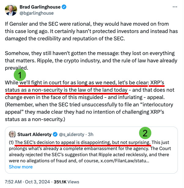브래드 갈링하우스 리플 CEO는 SEC의 항소에 대해 강력히 반발하고 있습니다. 그는 "필요한 한 법정에서 싸울 것"이라면서 "리플이 증권이 아니라는 지위는 국가의 법으로 판시된 사항"이라고 주장했습니다. 이것은 SEC의 항소가 법적 근거가 부족하다는 리플 측의 입장을 명확히 하고 있고요.