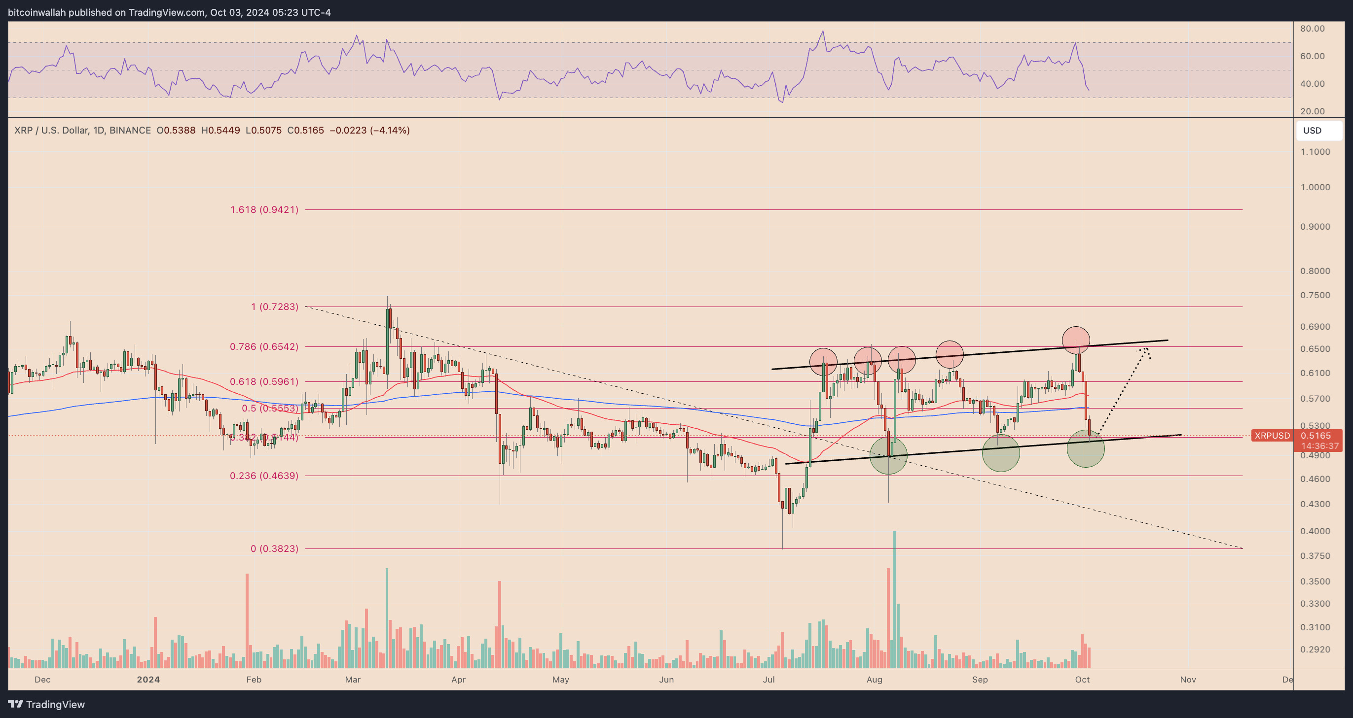 리플 가격을 보면, 현재 상승 채널의 추세를 유지하고 있습니다. 가격이 두 개의 뚜렷한 평행 추세선 사이를 움직이고 있죠. 최근 리플은 상단 추세선에서 몇 번의 저항을 받았는데, 여기가 어디냐면 0.786 피보나치 되돌림 수준인 0.6542 달러 부근입니다. 현재 리플은 채널의 하단 지지선 주변에 있고요. 여기는 피보나치의 0.618 수준인 0.5165 달러죠. 이제 리플이 반등한다면 XRP는 10월 중에 다시 0.65 달러 정도의 위쪽 저항을 시험할 가능성이 있습니다.