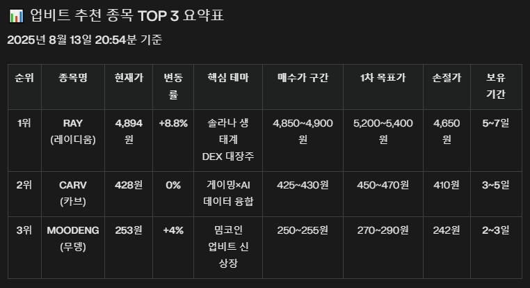 저는 이번 기회가 정말 특별하다고 봅니다. 솔라나 생태계의 강세, AI와 블록체인의 융합, 그리고 밈코인의 부상까지 세 개의 큰 흐름이 동시에 일어나고 있거든요. 이런 상황은 1년에 몇 번 없어요. 이더리움이 600만원을 뚫으면서 전체 시장에 신호탄을 쏘아 올렸고, 이제 알트코인들의 시간이 온 것 같습니다. 레이디움, 카브, 무뎅, 골렘 이 네 종목은 각각 다른 테마를 대표하면서도 모두 현재 시장 흐름에 완벽하게 부합하고 있어요. 3일에서 7일 단기 스윙 관점에서 접근한다면, 정말 좋은 수익을 낼 수 있을 것 같습니다.